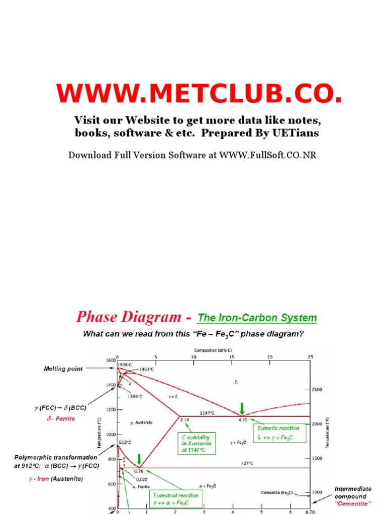 The primary phase of low-carbon or mild steel and most cast irons at room temperature is ferromagnetic α-Fe. It has a hardness of approximately 80 Brinell. The maximum solubility is about 0.02 wt% at 727 °C (1,341 °F) and 0.001% carbon at 0 °C (32 °F). When it dissolves in iron, carbon atoms occupy interstitial "holes". Being about twice the diameter of the tetrahedral hole, the carbon ... The iron-carbon diagramLearning objectives:- You name and describe the different phases of pure iron during the cooling process.- You distinguish between met... Dr. Dmitri Kopeliovich Iron-carbon phase diagram describes the iron-carbon system of alloys containing up to 6.67% of carbon, discloses the phases compositions and their transformations occurring with the alloys during their cooling or heating.. Carbon content 6.67% corresponds to the fixed composition of the iron carbide Fe 3 C. . The diagram is presented in the picture: The Iron-Iron Carbide Diagram A map of the temperature at which different phase changes occur on very slow heating and cooling in relation to Carbon, is called Iron- Carbon Diagram. Iron- Carbon diagram shows the type of alloys formed under very slow cooling, proper heat-treatment temperature and how the properties of steels and cast irons can ...