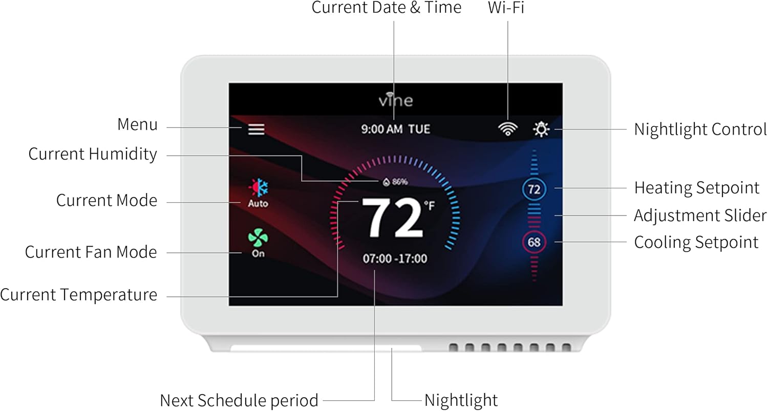 Energy costs will enable the Vine Smart WiFi Thermostat to pay for itself and you can save even more by purchasing the unit up front. Average consumers save approximately 23% annually off their energy bill. Support. Visit our website to explore an extensive library of videos, manuals, wiring diagrams, FAQ, and documentation.