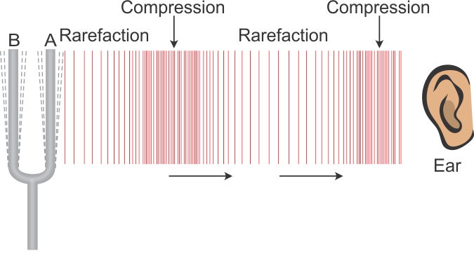 The diagram below depicts a sound wave created by a tuning fork and propagated through the air in an open tube. The compressions and rarefactions are ...