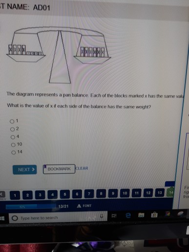 14 The diagram represents a pan balance. Each of the blocks marked x has the same value. The small blocks have a value of 1. What is the value of x if each side of the balance has the same weight? O 4 O 10 O 14 navigation 16 12/21 A FONT O Type here to search.