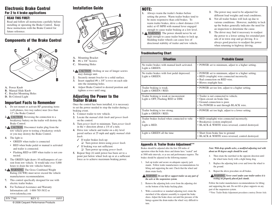Instructions for Pod® Brake Control READ THIS FIRST: Read and follow all instructions carefully before installing or operating the Brake Control. Keep these instructions with the Brake Control for future reference. D B C A Installation Guide A. Mounting Bracket B. #6 x 3/8" Screws C. Mounting Holes A C B P/N 7760 REV G NOTE: 1. The Reese Pod brake controller should be connected as follows. White - Ground Black - 12 Volt Constant Power Red - Cold Side of the Brake Pedal Switch Blue - Trailer Brake feed to Trailer Brakes If you are correctly wired and you are still experiencing problems, I would start with the following test. Start by disconnecting the blue brake feed ... Pod Electronic Brake Control, for 1 to 2 Axle Trailers . $42.95. Break Away Kits | Brake Control Wiring Harnesses BRAKE CONTROLLER INSTALL KITS: Part # Description. Price . Buy Now: 20505: Wiring Kit for 2 to 4 Brake Control Systems, Includes 25 ft. 12-2 Duplex Wire, 20 Amp Circuit Breaker and Attaching Terminals ... Reese Pod Brake Controller Wiring Diagram. Effectively read a wiring diagram, one provides to find out how the particular components inside the program operate. For example , if a module will be powered up and it also sends out the signal of half the voltage and the technician will not know this, he would think he has a problem, as this ...