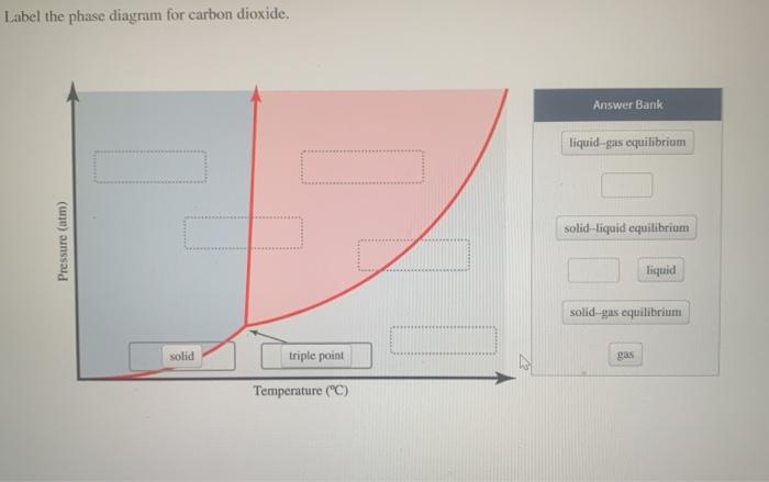 Consider the phase diagram for carbon dioxide shown in Figure 5 as another example. The solid-liquid curve exhibits a positive slope, indicating that the melting point for CO 2 increases with pressure as it does for most substances (water being a notable exception as described previously). Notice that the triple point is well above 1 atm, indicating that carbon dioxide cannot exist as a liquid ... Of course the p and t values of are unique to carbon dioxide. Label the phase diagram for carbon dioxide label the segment diagram for carbon dioxide chegg october 22 2017 prudence morison see extra ideas about label the section diagram for carbon dioxide from diagram. From the phase diagram for carbon dioxide in figur.
