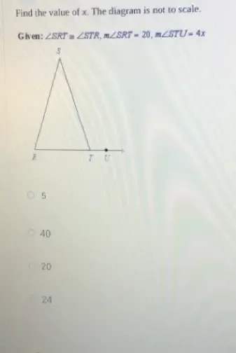 Find the value of x. The diagram is not to scale. The diagram is not to scale. Given: ∠ SRT ≅ ∠ STR , m ∠ SRT = 20 , m ∠ STU = 4 x a. 5 b. 24 c. 20 d. 40