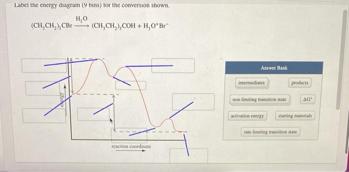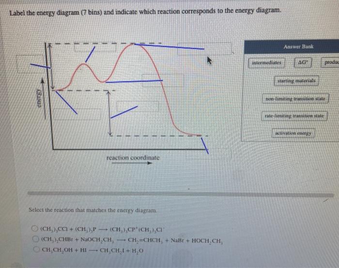 Label the energy diagram 7 bins and indicate which reaction corresponds to the energy diagram. Labels may be used once more than once. Label the energy diagram 7 bins and indicate which reaction corresponds to the energy diagram. Intermediates activation energy non limiting transition state products delta g degree starting materials rate limiting transition state ch33ccl ch33p ch33cpch33cl ...