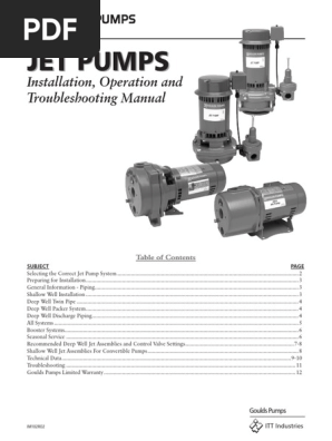 03/08/2021 · Keep the clean water flowing into your home, cabin or farm, with the Everbilt 3/4 HP Shallow Well Jet Pump. The pump housing is constructed of fiberglass-reinforced thermoplastic, which is both light in weight and corrosion-resistant. The pump delivers water at a flow rate of 552 GPH at 40 PSI and 0 ft. of lift. The motor is safeguarded by an auto reset thermal overload … The jet ejector package (the nozzle, venturi, and various connections) is often separate from the pump before installation. Ejector components are carefully engineered to match the flow rate of a specific pump. During installation, it is important to read the ejector package instructions and set the package up correctly for the specific horsepower of the pump.