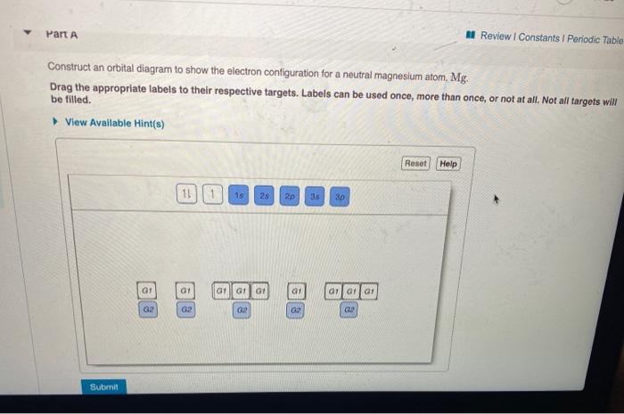 Construct an orbital diagram to show the electron configuration for a neutral magnesium atom, mg.. Construct an orbital diagram to show the electron configuration for a neutral magnesium atom, Mg. 1s2, 2s2, 2p6, 3s2 To form a stable ion, will magnesium gain or lose electrons? Construct an orbital diagram to show the electron configuration for a neutral magnesium atom, MgMg.Drag the appropriate labels to their respective targets. Labels can be used once, more than once, or not at all. Not all targets will be filled. Transcribed image text: Construct an orbital diagram to show the electron configuration for a neutral magnesium atom, Mg. Drag the appropriate labels to ... Transcribed image text: Construct an orbital diagram to show the electron configuration for a neutral magnesium atom, Mg Use the buttons at the top of the ...