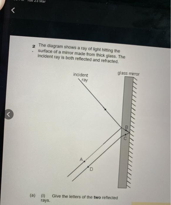 The diagram shows an object in front of a plane mirror. At which labelled position is the image of the object formed? ... The diagram shows a ray of light inside a glass rod. The critical angle for the light in the glass is 42°. ... the angle of reflection from a mirror equals the angle of incidence. waves incident on a mirror are partially ...