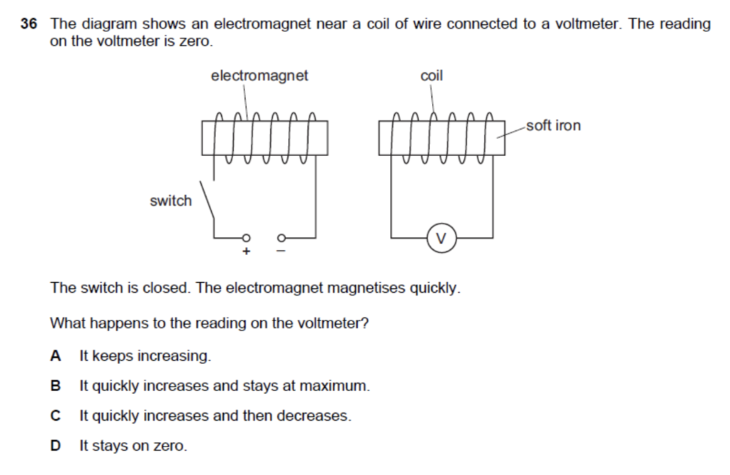 Furthermore, In which diagram does the voltmeter read almost zero?, B •C •D The voltmeter in diagram D is connected to two points that are also connected by a wire that has, presumably, very low resistance.