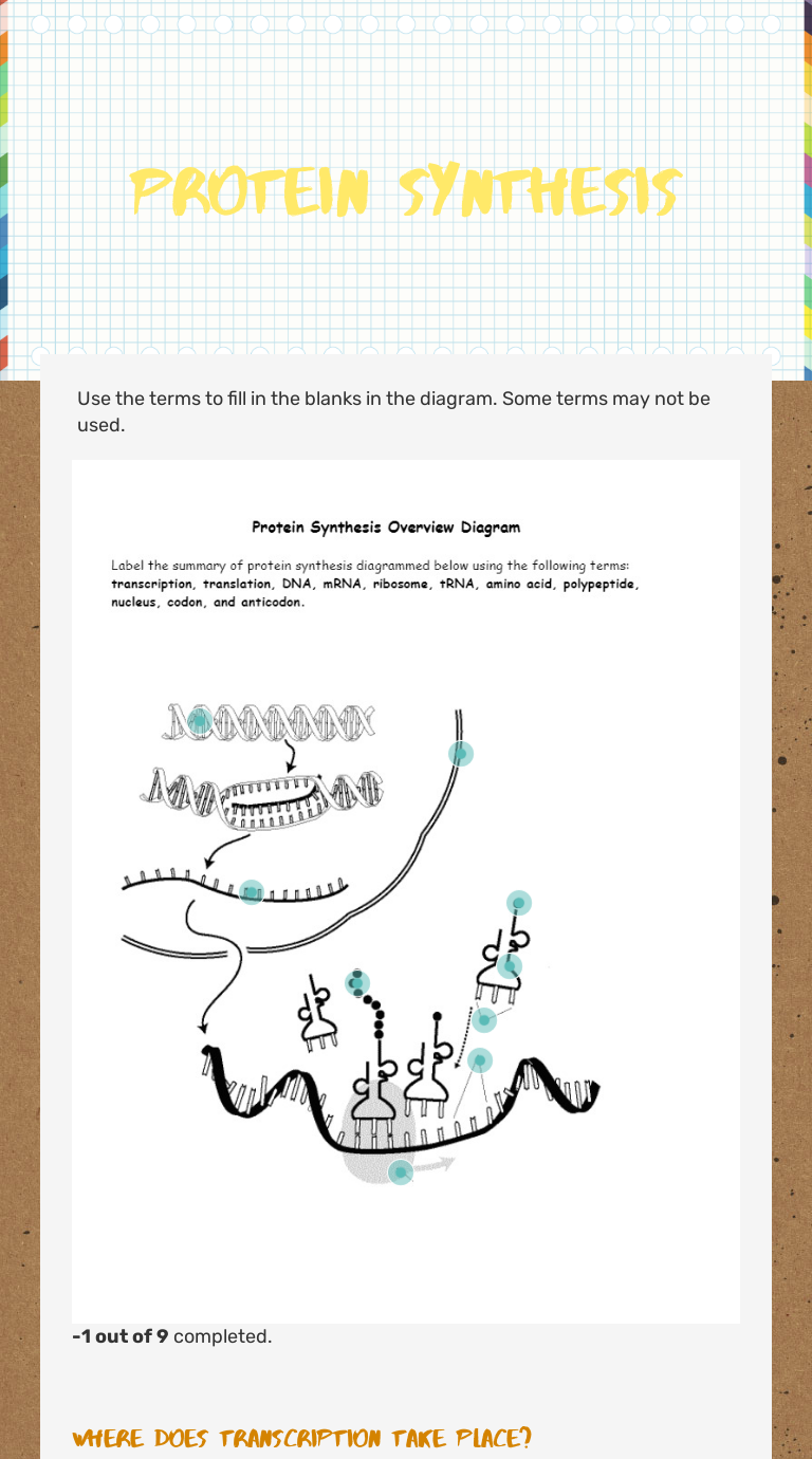 Protein Synthesis Overview Diagram. Label the summary of protein synthesis diagrammed below using the following terms: transcription, translation, DNA, MRNA ...4 pages