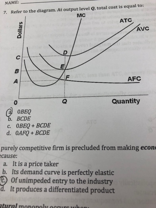 Did I do this correctly? ATC AVC Dollars D AFC o Quantity Refer to the above diagram. At output level Q, total variable cost is: A) OBEQ. B) BCDE. C) OCDQ. D) ...1 answer · 0 votes: Option 4 Average total cost is the sum of average fixed cost and average variable cost. We need to find the difference of ATC and AVC to get AFC. ...