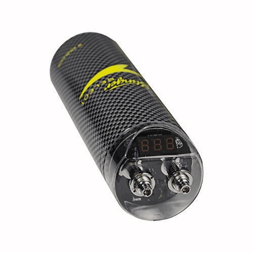 Digital 5 Farad Hybrid Capacitor. 5 farad capacitor for systems up to 1000 Watts. Bright red LED voltage display. performs similar to a capacitor/battery combo. Louder and cleaner bass response. Monitor system voltage. 12-16 volt operation / 18 volt surge. Uses screw terminals for use with 0/4 gauge of power/ground cable.