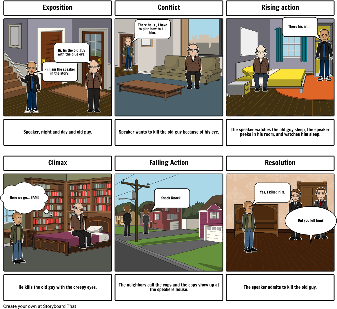 The tell tale heart plot diagram. The narrator tries to cover up by saying it was him that screamed and that the old man was out of town. He is plotting to kill the old man. Summoned by a neighbor the police arrive citing that someone reported a scream.