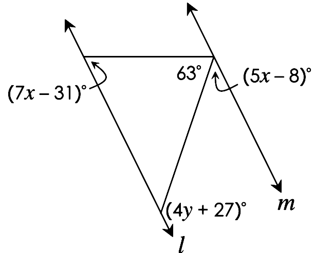 The expressions in the figure below represent the measures of two angles. Find the value of x. f parallel g . The diagram is not to scale. D. 16. Find the value of x. l parallel m. The diagram is not to scale. D. 32. Find the values of x and y. The diagram is not to scale. B. x=77,y=63.