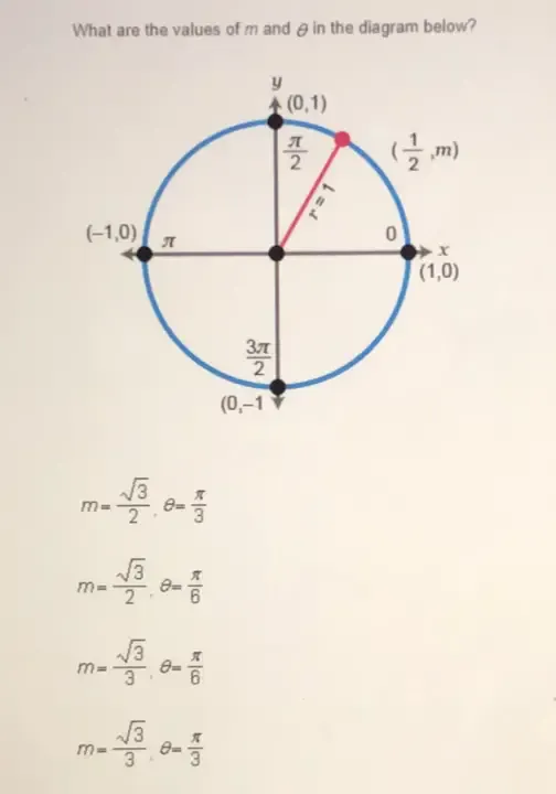 May 14, 2020 · Answer:The correct answer is m = sqrt3/2 and theta = pi/3Step-by-step explanation:refer to the Unit Circle. Notice that the coordinates are (cos Θ, sin Θ). Whe…