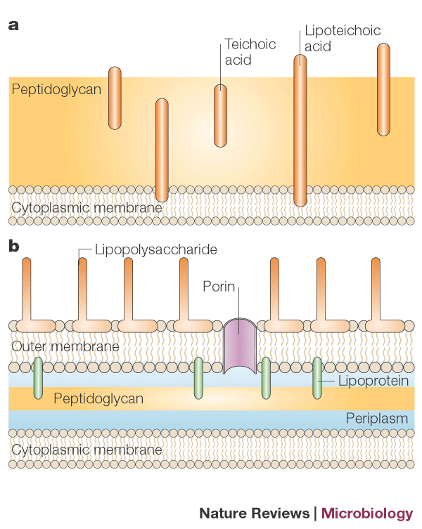 Download scientific diagram | Typical bacterial cell walls showings the cell wall of Gram-negative bacteria (a) consists of a thin layer of peptidoglycan between the inner and outer lipid membranes. In Figure 43 which diagram of a cell wall contains porins 33 A a Bb C both a and from BIO 101 at ECPI University, Medical Careers Institute. Gram-negative cell structure. Gram-negative cell walls have a more complicated structure than that of Gram-positive organisms. Outside the cytoplasmic membrane is the periplasm, which contains the thin layer of peptidoglycan. The peptidoglycan in Gram-negative cells contains less cross-linking than in Gram-positive cells with no peptide linker. C) it protects the cell in a hypertonic environment. D) it contains teichoic acids. ... 33) In Figure 4.3, which diagram of a cell wall contains porins?