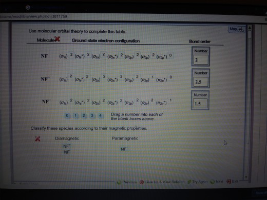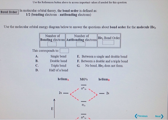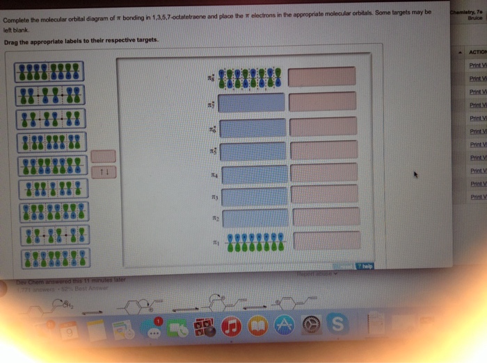 a blank molecular orbital diagram (part b 1 figure) has been provided to you. drag the formulas to the appropriate magnetic bin : c2^2+,li2-,b2^2- Answers: 1 Molecular orbital diagrams provide qualitative information about the structure and stability of the electrons in a molecule. This article explains how to create molecular orbital diagrams in L a T e X by means of the package MOdiagram.For information about the more traditional molecular structure diagrams see our documentation about chemistry formulae. a molecular orbital is a region of space in a covalent species where electrons are likely to be found. the combination of two atomic orbitals always forms two molecular orbitals; the bonding molecular orbital, which is _____ in energy, and the antibonding molecular orbital, which is _____ in energy, than the original atomic orbitals Once you have drawn and labelled molecular orbitals, you fill them in the same order as you fill atomic orbitals. The rules you use for filling atomic orbitals are: 1. Aufbau Principle You place electrons in the lowest energy orbitals available. 2. Pauli Exclusion Principle No orbital may hold more than two electrons, and they must have opposite spin. 3. Hund's Rule Every orbital in a subshell ...