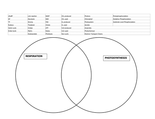 Photosynthesis cellular respiration venn diagram. Mitochondrion Cellular Respiration Diagram Worksheet Cellular Respiration Biology Notes Cellular Respiration Activities . ... photosynthesis and cellular respiration venn diagram worksheet answers. Post Navigation. Previous Article First Grade Math Worksheets Free Printables. A venn diagram showing photosynthesis vs. What goes into one process is what comes out of the other. Cellular respiration uses glucose and oxygen to produce carbon dioxide and water. To emphasize this point even more the equation for photosynthesis is the opposite of cellular respiration. The photosynthesis and cellular respiration Venn diagram graphic organizer is a great way for students to compare and contrast these two biological processes. Aerobic respiration occurs during photosynthesis but anaerobic respiration occurs during cellular respiration. Start studying Cellular Respiration/ Photosynthesis Venn Diagram. Students write the correct statement into boxes on the Venn ... Effects of drought stress on photosynthesis, rhizosphere respiration, and fine-root characteristics of beech saplings: a rhizotron field study Journal of Plant Nutrition and Soil …
