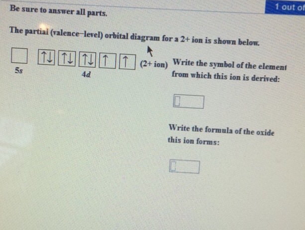 The partial (valence-level) orbital diagram for a 2+ ion is shown below. 4d Write the symbol of the element from which this ion is derived. Write the formula of the oxide this ion forms. Question : Be sure to answer all parts.