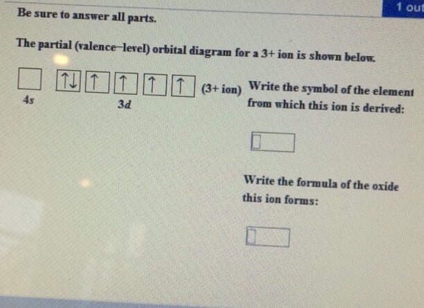 The partial (valence-level) orbital diagram for a 3+ ion is shown below. __ 4s (no arrows) __ __ __ __ __ 3d (two arrows in the first box, up and down) (One up arrows in the rest of the boxes, 6 arrows total) Write the symbol of the element from which this ion is derived. Write the formula of the oxide this ion forms. The answer is not Fe or Cr.