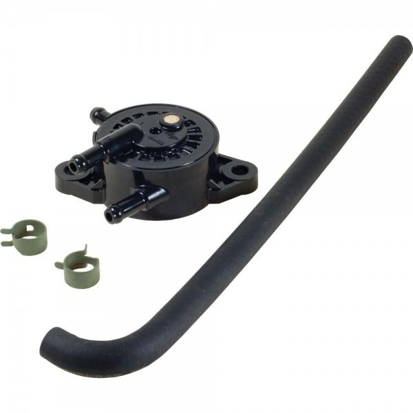 A fuel pump is used when the gas tank is mounted lower than the carburetor and cannot rely on gravity to carry gas through the fuel line. Briggs & Stratton fuel pumps have either a plastic or a metal body and develop pressure using the vacuum in the crankcase, which is created by the motion of the piston.