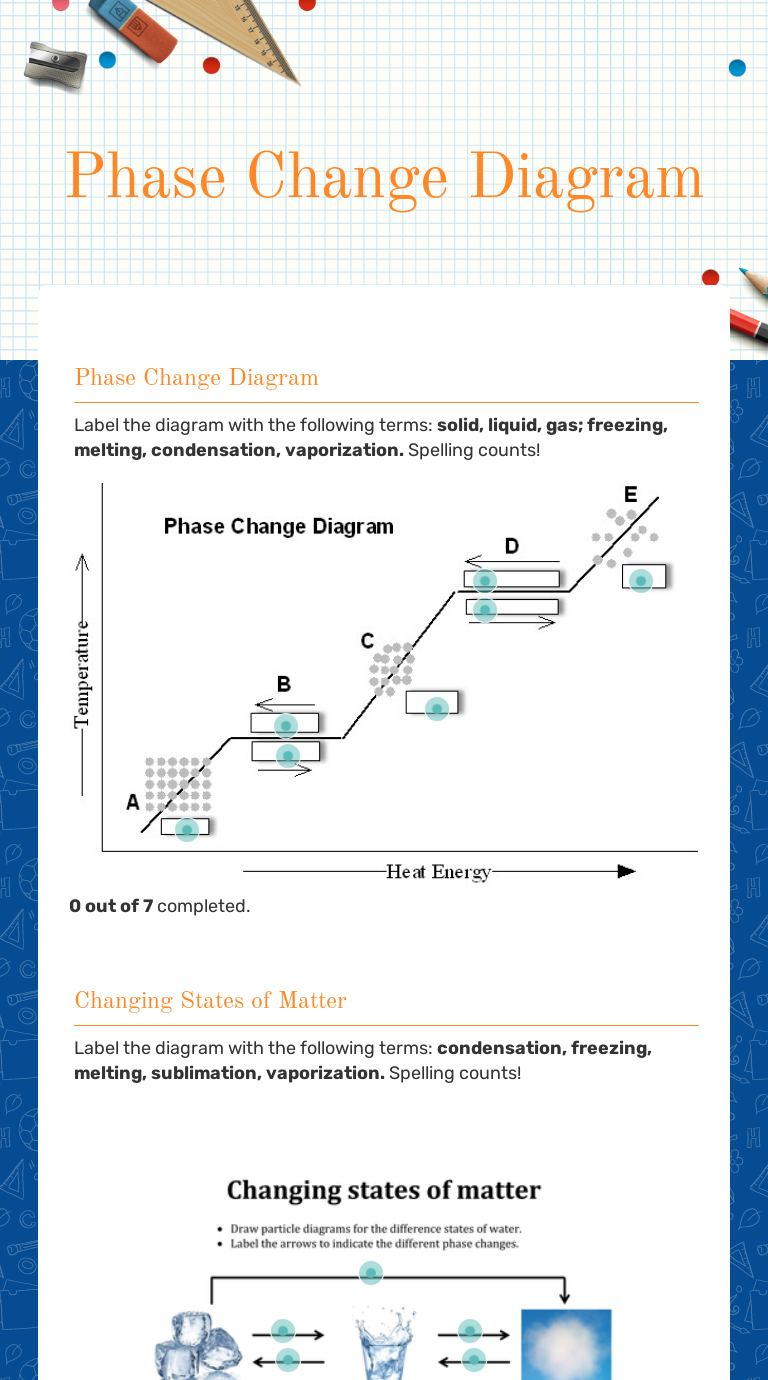 Phase Change Diagram Worksheets & Teaching Resources | TpT Phase Changes Diagram by Sensational Scientists 1 $4.99 Word Document File In this activity, students will be able to label a diagram showing how materials change state by adding or removing heat, which changes the kinetic energy of the atoms in that material.