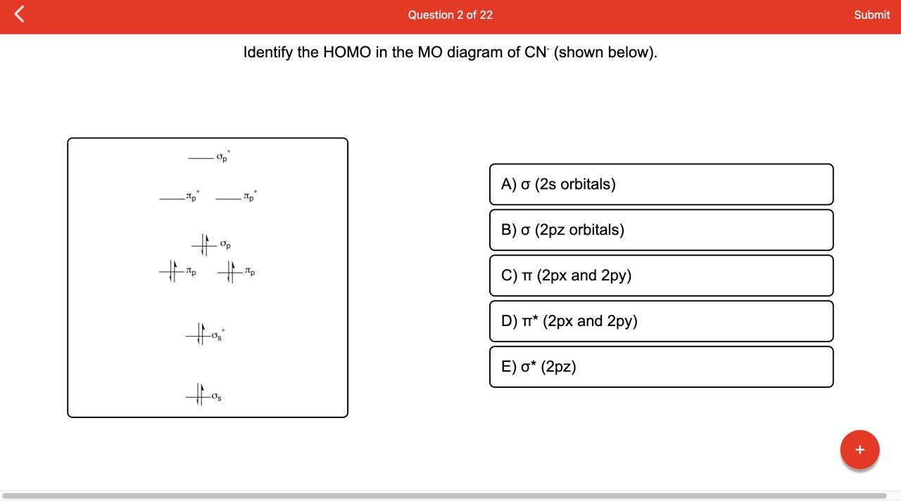 Molecular nitrogen, carbon monoxide, and c ... - Clutch Prep Q. Draw Lewis structures and MO diagrams for CN+, CN, and CN-. According to the Lewis model, which species is most stable? Q. Use molecular orbital theory to complete this table. Q. What is the ground-state electron configuration of O2^-? 1. (δ2s)^2(δ2s*)^2(π2p)^3(π2p*)^1 2.