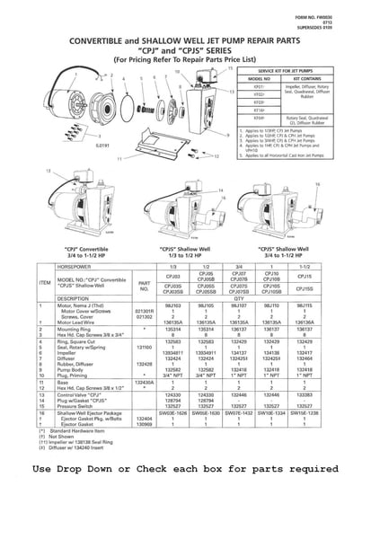 PDF Well Pump & Pressure Tank Diagram - Clean Water Store PUMP 3 1. Check Valve Located at the top of the pump to prevent back flow into pump and hold the head of water in the system. 2. Torque Arrestor Installed directly above Submersible Pump to protect pump and well components from starting torque damage. 3. Safety Rope A safety line from the top of the well to the pump. 4. Pitless Adapter Diagrams --Typical Pump Installations - Water Pump Supply Diagrams --Typical Pump Installations. The information provided here is for educational purposes only. Technically qualified personnel should install pumps and motors. We recommend that a licensed contractor install all new systems and replace existing pumps and motors. Failure to install in compliance with local and national codes and ... Goulds J5s Parts Diagram - schematron.org JET PUMP REPAIR PARTS. REPAIR PARTS Goulds Water Technology . The 10K2 has been replaced in production and as a repair part by the 10K . J5S. J5SH. J7S. J10S J15S. 1. Pipe plug - 1⁄2" NPT. Steel, plated. 6K -. 2. WELL PUMP REPAIR PARTS GOULDS. PREVIOUS PAGE 13K43, 3/8" IMPELLER BOLT GOULDS, 1. How to Install a Lawn Sprinkler Pump Amazon.com: shallow well jet pump RainBro 3/4 HP Cast Iron Shallow well jet pump for well up to 25 ft, Model# CSW075. 4.3 out of 5 stars. 43. $179.99. $179. . 99. $10.00 coupon applied at checkout. Save $10.00 with coupon.