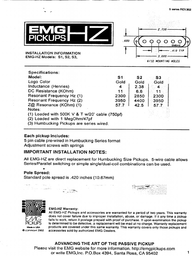 I got 2 EMG45Hzs and an EMG HZ wiring kit, which wasn't specified for bass. Now the whole thing is so quiet, I have to turn up all my volume and amp volume just to hear it. Is there a difference between the wiring components that may make this a problem, or anything else? The HZs are passive, for those that don't use them. Please replace the wiring and cables to the original state after repairs. Monitor Audio Airstream S Indiana Line HC Quick start. BMW V. Paradigm MIllenia CT 2. The higher the grade number, the greater the bolt strength. Use a flatbed device to transport a loaded vehicle. Getting started. I bought a relatively obscure guitar, a Yamaha RGX-520J. Initially they were only available in Japan. So, this thing comes with two passive EMG "Select" pickups. One of the pickups wasn't working so I thought I'd open it up and see what the problem was. But when I opened it, some wires came undone. Now it's quite a scene. Crime scene. I tried to use this schematic to get things back together: http://www.sonic.net/~emgman/pdf/2%20SELECT%201v%201t%203wt.pdf I think what is confusing is that the...