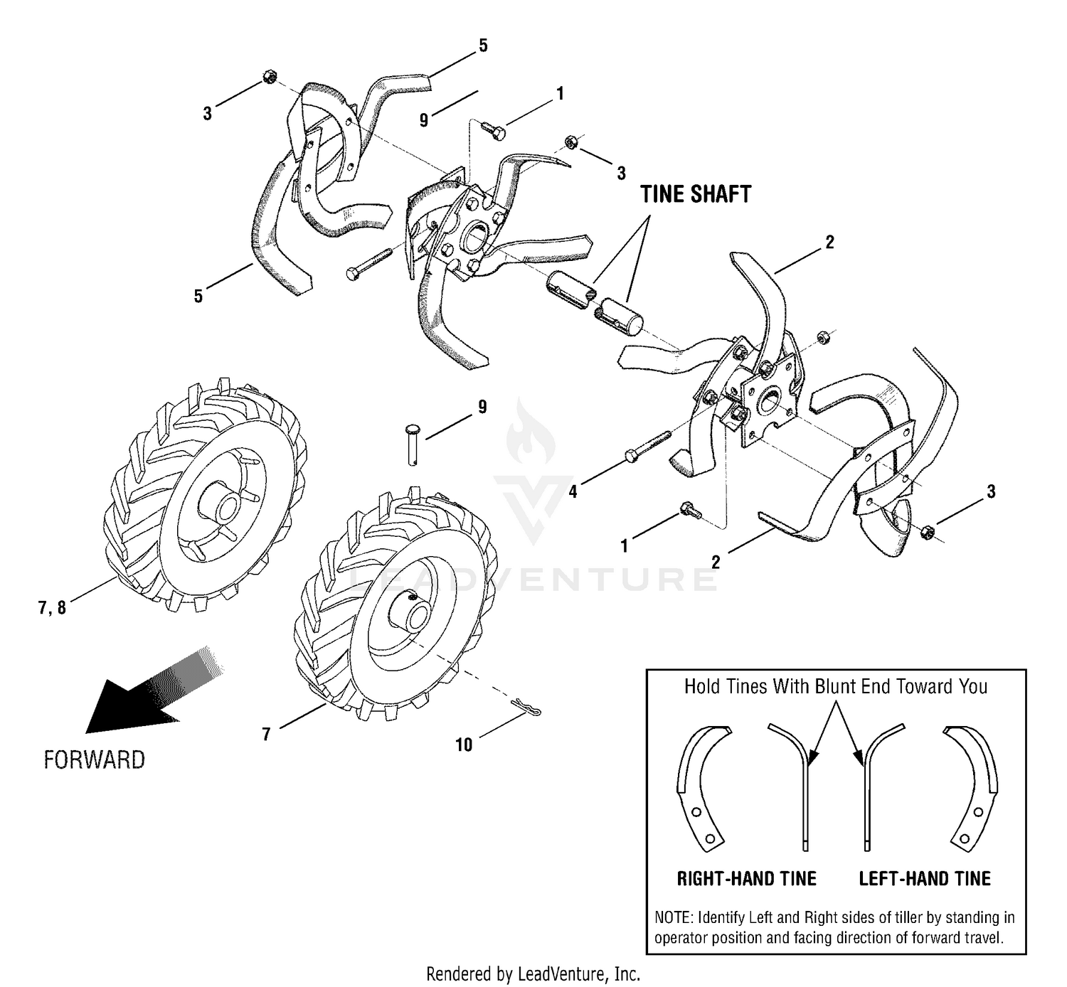 Troy-Bilt Bronco RotoTillers | 12210 | eReplacementParts.com Troy-Bilt 12210 Bronco RotoTiller Parts. Note: Incl. Eight Right Hand Tines, Eight Left Hand Tines And Required Hardware. Note: Single Tine Used On Right Side Of Tiller. Incl. Two Each Refs. 1 & 3. Hex Hd. Screw, 5/ 16-24 x .75. Note: Tightening Torque: 150-300 In. Lbs.