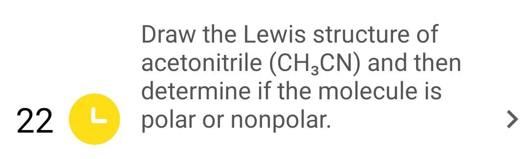 Structure Ch3cn Lewis [7MHGJ0] 1) Draw the Lewis structure for CH3NCO, a neutral molecule. CH3CN Lewis Structure: How to Draw the Lewis Structure for CH3CN. Chemical Bonding and Molecular Structure. For the CH3CN Lewis structure, calculate the total number of valence electrons for the. Then, draw dipoles where CH3CN c. Steric Number = 3. Chemistry 143 Lewis Structures Dr. Answered: For the formula CH3CN, "draw the Lewis… | bartleby Answered: For the formula CH3CN, "draw the Lewis… | bartleby For the formula CH3CN, "draw the Lewis structure in your work (w pad it). After drawing the complete Lewis structure, type in the shape, bond angle, etc. for each blank. What is the molecular shape or geometry for the carbon on the left (the C in CH3)?